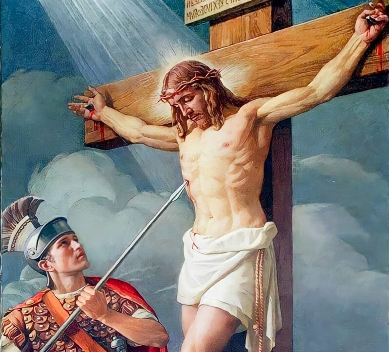 Segundo a tradição, os crucificados tinham seus pés quebrados para facilitar a retirada da cruz, mas, como Jesus já estava com os pés soltos, um dos soldados perfurou o lado do seu corpo com uma lança. O sangue que saiu deste ferimento de Jesus respingou em seus olhos. Caindo em si, comovido e tocado pela graça, o soldado se converteu. Abandonou para sempre o exército e sua moradia, se tornou um monge que percorreu a Cesareia e a Capadócia, atual Turquia, levando a palavra de Cristo e mais tarde, promovia prodígios pela graça do Espírito Santo.