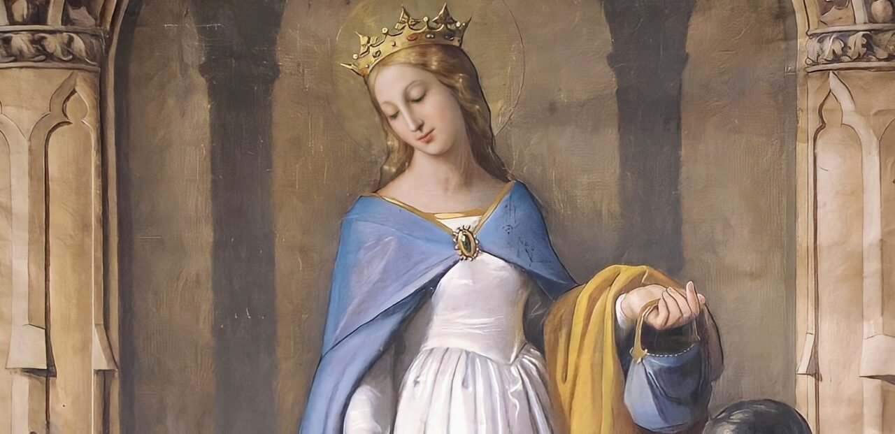 Certa vez, carregava nas dobras do manto umas provisões para os pobres, quando encontrou o marido voltando da caçada. Espantado de vê-la curvada sob o peso de seu fardo, ele abriu o manto que ela segurava contra o corpo, e encontrou ali nada mais do que belíssimas rosas vermelhas e brancas, embora não fosse época das flores. Permitindo-lhe que seguisse seu caminho, ele tomou uma daquelas maravilhosas rosas e a guardou consigo por toda a vida.