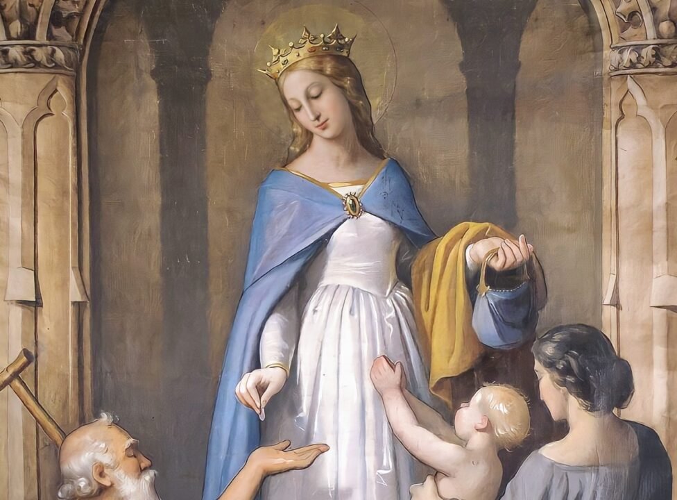 Certa vez, carregava nas dobras do manto umas provisões para os pobres, quando encontrou o marido voltando da caçada. Espantado de vê-la curvada sob o peso de seu fardo, ele abriu o manto que ela segurava contra o corpo, e encontrou ali nada mais do que belíssimas rosas vermelhas e brancas, embora não fosse época das flores. Permitindo-lhe que seguisse seu caminho, ele tomou uma daquelas maravilhosas rosas e a guardou consigo por toda a vida.