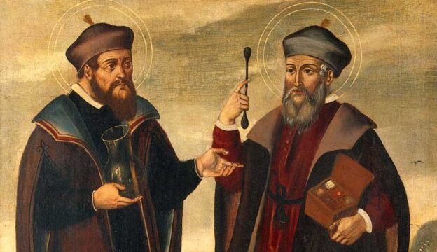 Os Santos Cosme e Damião eram irmãos gêmeos, nascidos na Arábia, que estudaram ciências na Síria e se destacaram por sua habilidade na medicina. Sendo cristãos, e cheios de caridade divina, praticavam sua profissão com grande dedicação e incrível sucesso.